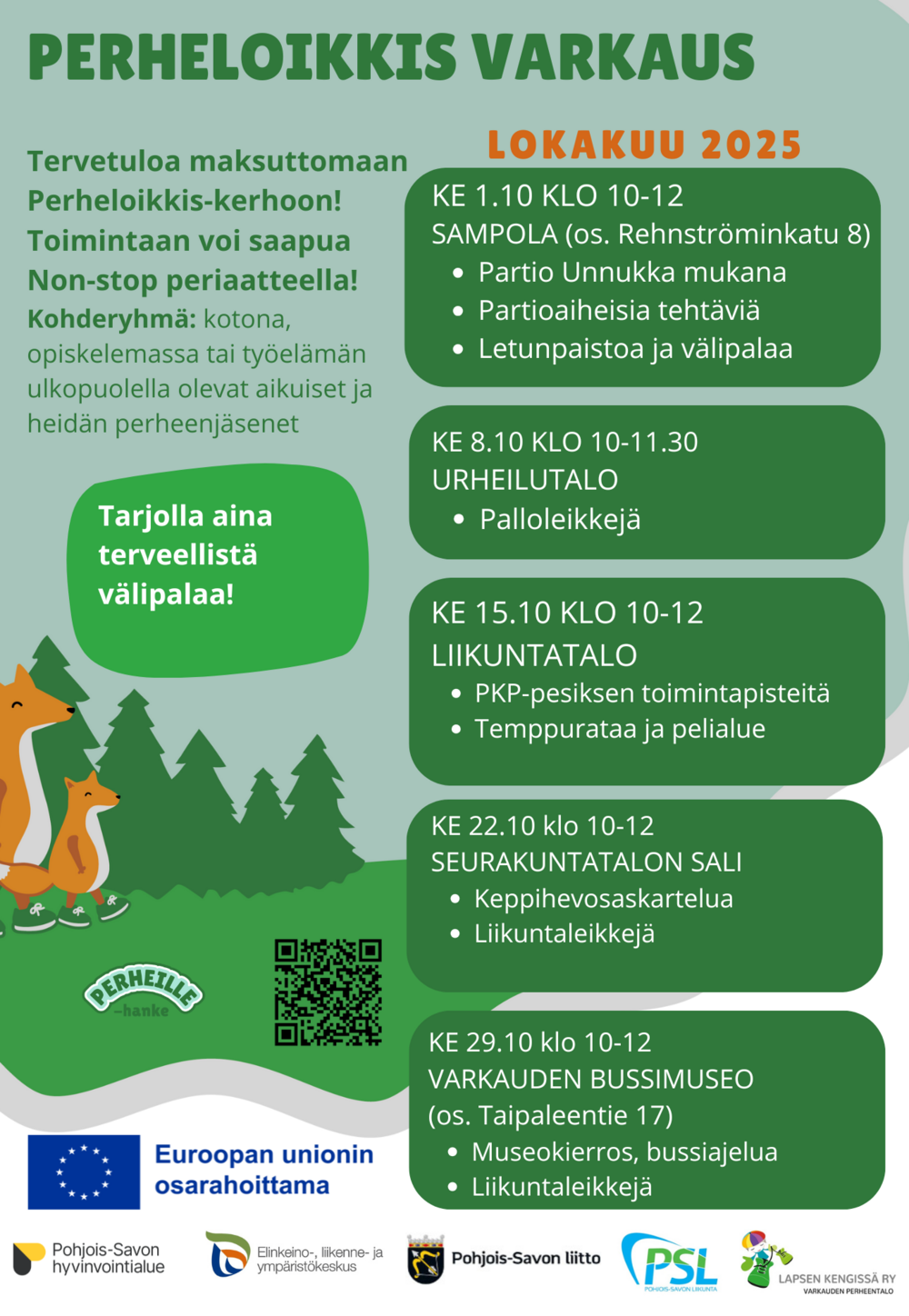 Perheille-hankkeen toiminta alkaa Varkaudessa huhti-toukokuun vaihteessa 2025! Tiedotamme lisää lähempänä. Voit kirjoittaa toivepostiin toiveita alkavalla kaudella!