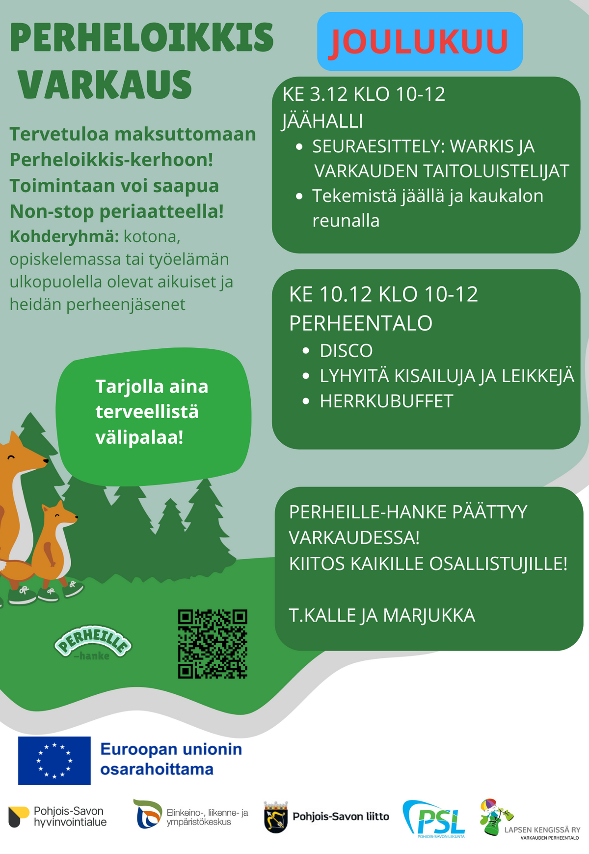 Perheille-hankkeen toiminta alkaa Varkaudessa huhti-toukokuun vaihteessa 2025! Tiedotamme lisää lähempänä. Voit kirjoittaa toivepostiin toiveita alkavalla kaudella!