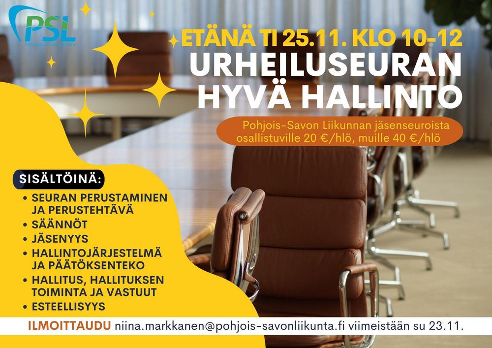 Lämpimästi tervetuloa ilmoittautumaan ja osallistumaan Urheiluseuran hyvä hallinto -etäkoulutukseen ti 25.11. klo 10-12. Voit ilmoittautua viimeistään su 23.11. kuvaesitteen alla olevalla lomakkeella…