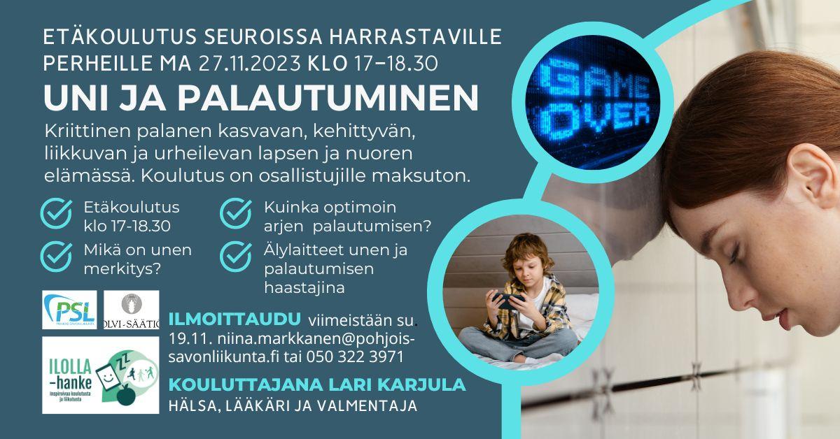 Etäkoulutus toteutetaan Pohjois-Savon Liikunnan OLVI-säätiön rahoittamassa ILOLLA-hankkeessa. Koulutus on osallistujille maksuton. Ilmoittaudu mukaan mielellään viimeistään 19.11. kuvaesitteen alla olevalla lomakkeella tai niina.markkanen@pohjois-savonliikunta.fi / 050 322 3971. Päivän kouluttajina mitä mainioin Lari Karjula, Hälsa, lääkäri ja valmentaja.