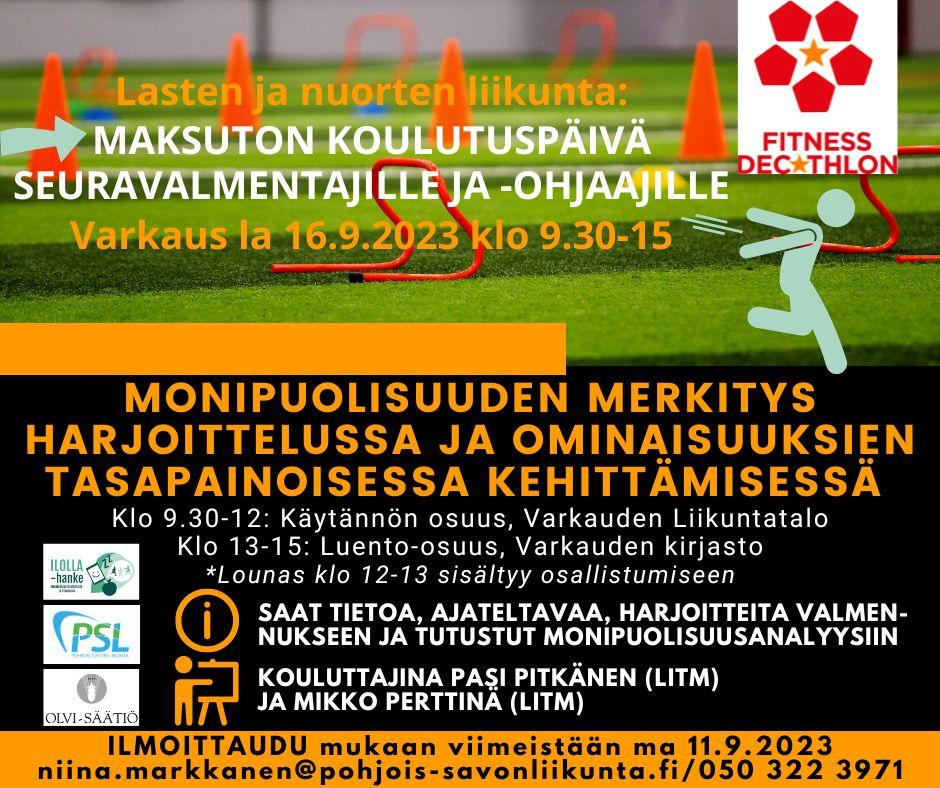 Päivä toteutetaan Pohjois-Savon Liikunnan Olvi-säätiön rahoittamassa ILOLLA-hankkeessa. Päivä sisältää eväspaketin aamuun ja lounaan ja päivä on kokonaisuudessaan osallistujille maksuton. Ilmoittaudu mukaan viimeistään ma 11.9.2023 niina.markkanen@pohjois-savonliikunta.fi / 050 322 3971. Päivän kouluttajina Pasi Pitkänen (LitM) ja Mikko Perttinä (LitM), päivän esite alla.