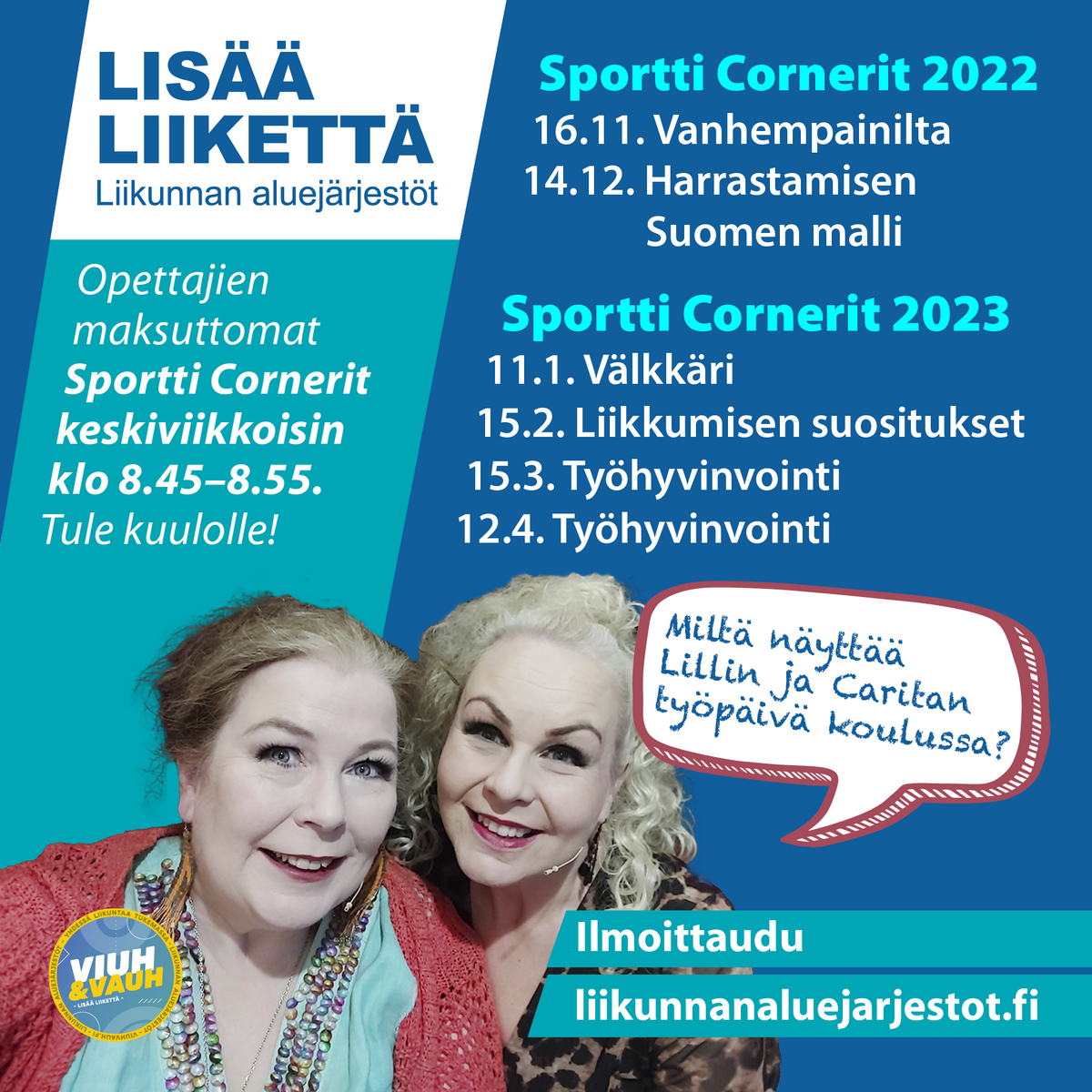 Liikunnan aluejärjestöt järjestävät kuusi aamuista Sportti Corneria, joista saat nopeasti ja vaivattomasti vinkkejä koulupäivän liikunnallistamiseen, työhyvinvointiin ja välkkäritoimintaan.