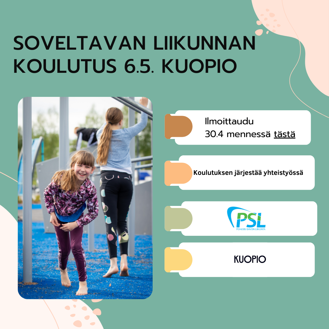 Liikuntaa kaikille - soveltavan liikunnan koulutus on tarkoitettu lasten ja nuorten liikuntaryhmien ohjaajille seuroissa, yhdistyksissä, kouluissa, leireillä. Koulutuksessa saat vinkkejä ja ideoita soveltamiseen sekä miten saadaan erilaiset liikkujat pelaamaan ja tekemään asioita yhdessä inkluusion keinoin. Koulutuksessa tarjotaan kevyt lounas. Koulutus toteutetaan seurojen kesätoiminta avustuksen koulutustuella ja se on osallistujalle maksuton. Ilmoittaudu koulutukseen 30.4. mennessä.