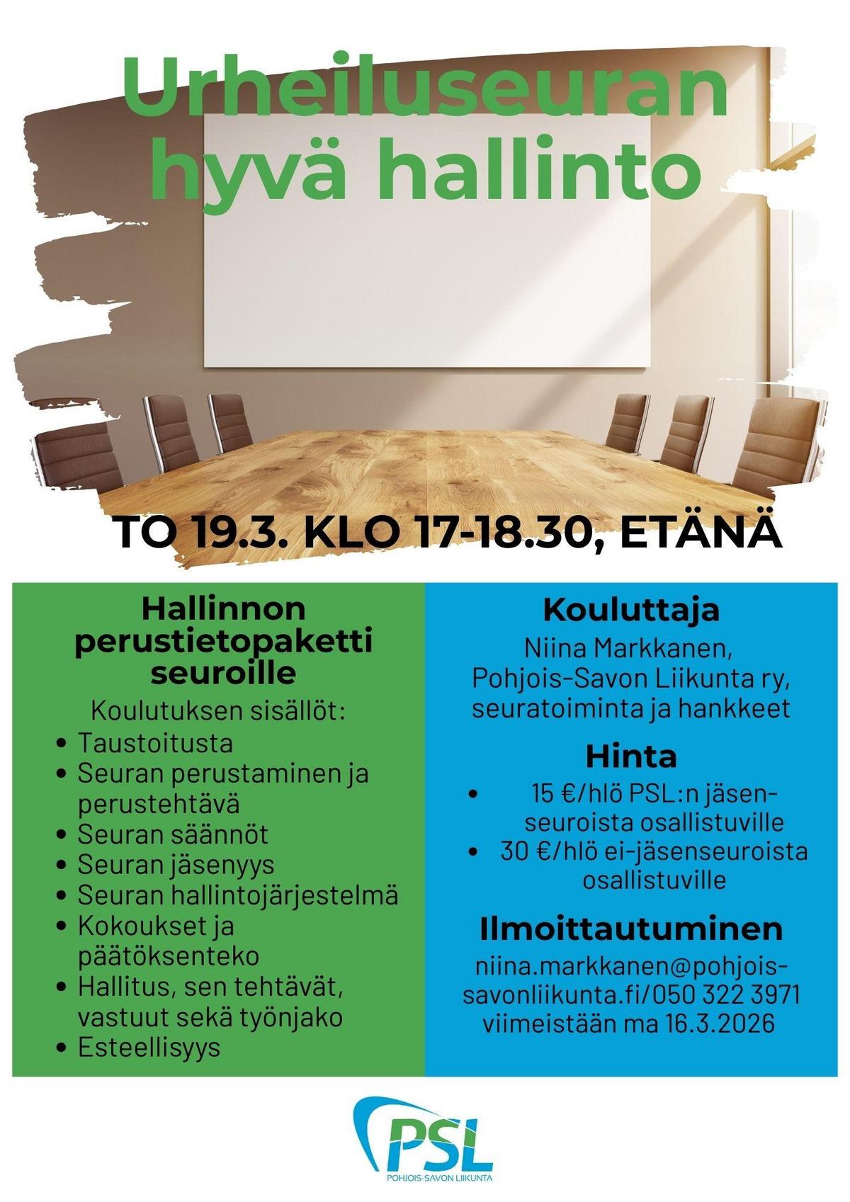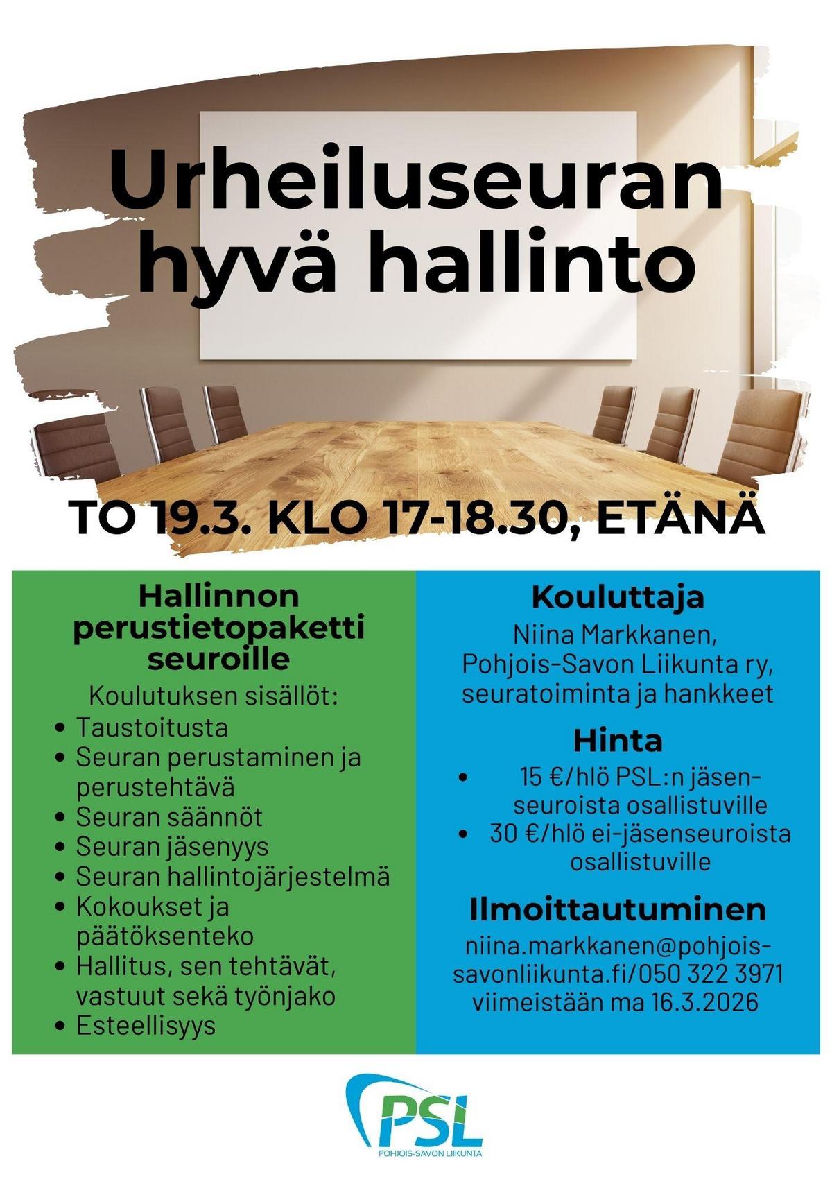 Lämpimästi tervetuloa ilmoittautumaan ja osallistumaan etänä Teamsin kautta to 19.3.2026 klo 17-18.30 pidettävään Urheiluseuran hyvän hallinnon koulutukseen. Alla koulutuksen esite, missä kuvaus sisällöistä.